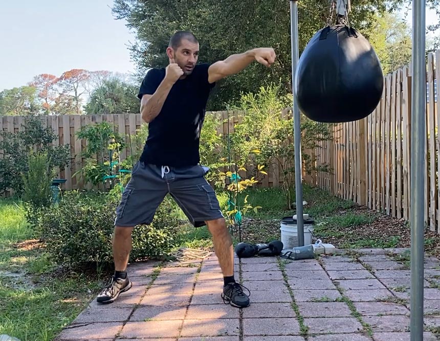 Visualize your opponent as if you're sparring or fighting. Imagine the stance they are in: is it orthodox or southpaw. This will guide you how to move and where to strike.
